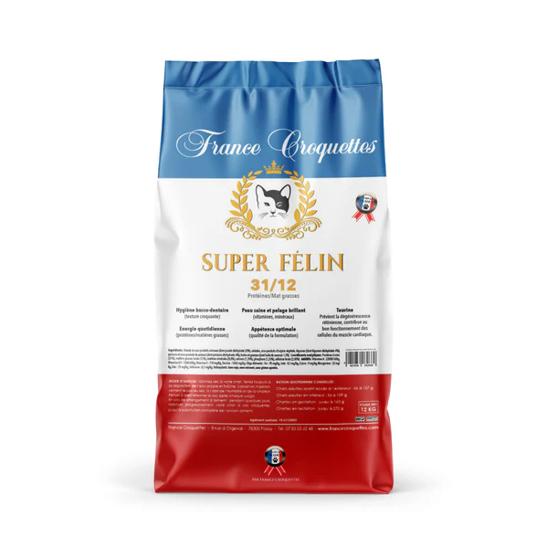 La texture croquante de nos croquettes Super Félin favorise l’Hygiène bucco-dentaire de votre chat, son apport en protéines et en matières grasses lui procure l’énergie quotidienne dont il a besoin.